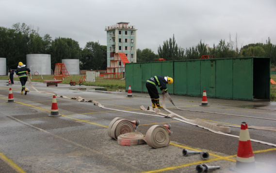 本次比武競賽共有42支隊伍參加,我公司平安消費品市場參加了一人兩盤水袋連接操、原地著滅火防護服百米負重跑個人技能比賽項目和手提式干粉滅火器滅油槽火操、固定消防設(shè)施撲滅初起火災(zāi)操集體比賽項目。