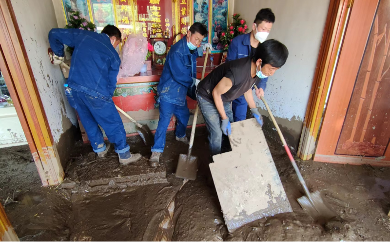 在救災現(xiàn)場,公司抗洪救災突擊隊和先鋒隊員,充分發(fā)揚“不怕苦、不怕累,敢奉獻、勇?lián)?rdquo;的精神,按照“8.18”山洪災害搶險救援處置工作應急指揮部的統(tǒng)一安排,迅速投入到清除淤泥和道路清障等工作。大家不間歇地用鐵鍬清、用架子車拉,兩天共清理十家住戶和三戶商鋪的屋內(nèi)外淤泥,裝運泥漿20余噸。