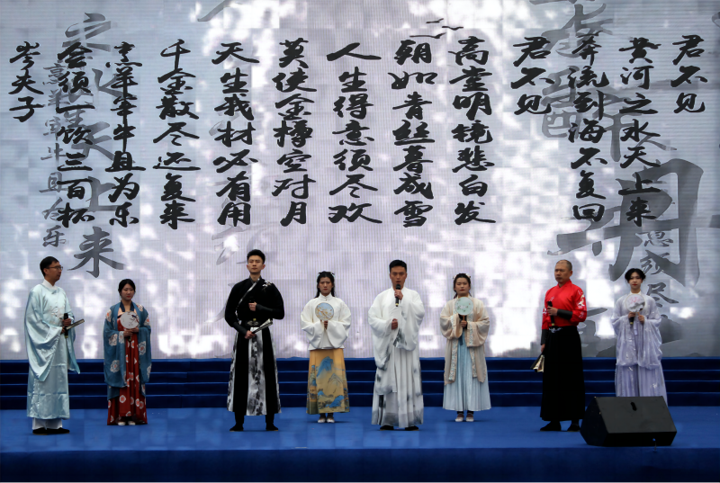 青物書院為搞好此次活動,確保節(jié)目精益求精,組織集團系統(tǒng)職工高凱、郭宇、阿柏林、任蕊、王思涵等8名員工排練了富有特色的詩樂鳴響《將進酒》。在演出現場,悠揚婉轉的古箏配上鏗鏘有力的誦讀,將詩仙李白的傳統(tǒng)經典賦予了新的形式,煥發(fā)出新的光彩,將活動現場推向了高潮,現場掌聲雷動,展現出了青海物產集團職工奮發(fā)向上的精神風貌,塑造了青海物產書香企業(yè)的良好形象。