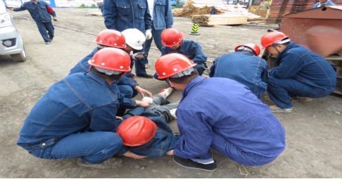 演練共分為參加演練人員集結(jié)、現(xiàn)場模擬人員受傷、采取止血包扎處理、現(xiàn)場管理人員發(fā)現(xiàn)事故后立即向指揮組匯報(bào)情況、指揮組接到通知后立即組織現(xiàn)場救援、各應(yīng)急小組迅速趕往事故地點(diǎn)、應(yīng)急救護(hù)組對傷者進(jìn)行簡單救護(hù)后將傷者送往醫(yī)院、事故處理組對事故進(jìn)行初步調(diào)查等過程。