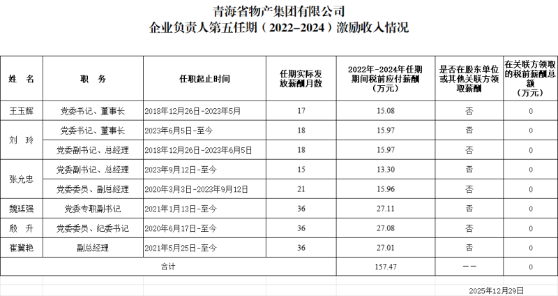 青海省物產(chǎn)集團(tuán)有限公司企業(yè)負(fù)責(zé)人2024年度薪酬情況及第五任期(2022-2024)激勵收人情況